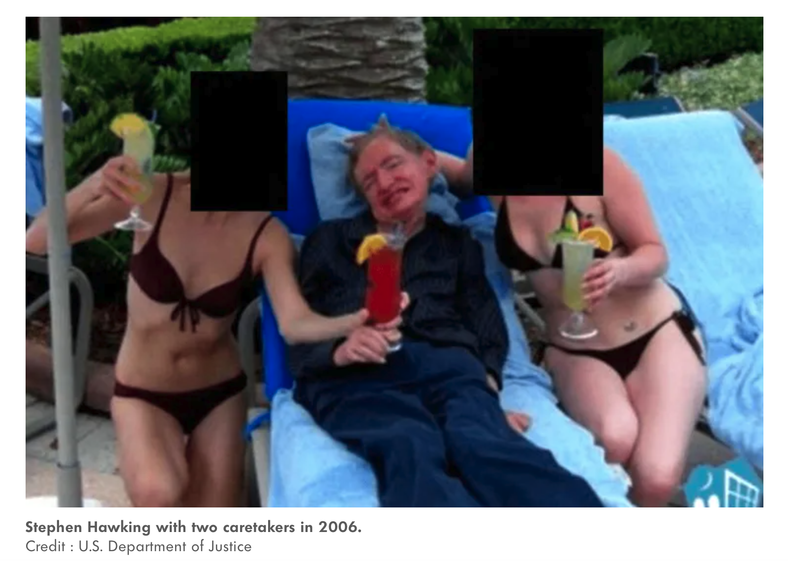 Questa volta la questione è più complessa: quasi tragica. Un uomo che non ha il comando delle proprie azioni ma una intelligenza straordinaria può essere complice di un predatore sessuale? Che cosa si deve provare nel vedere questa persona circondata da signorine assai evidenti sul bordo di una piscina mentre sorseggia un fresco cocktail tropicale?